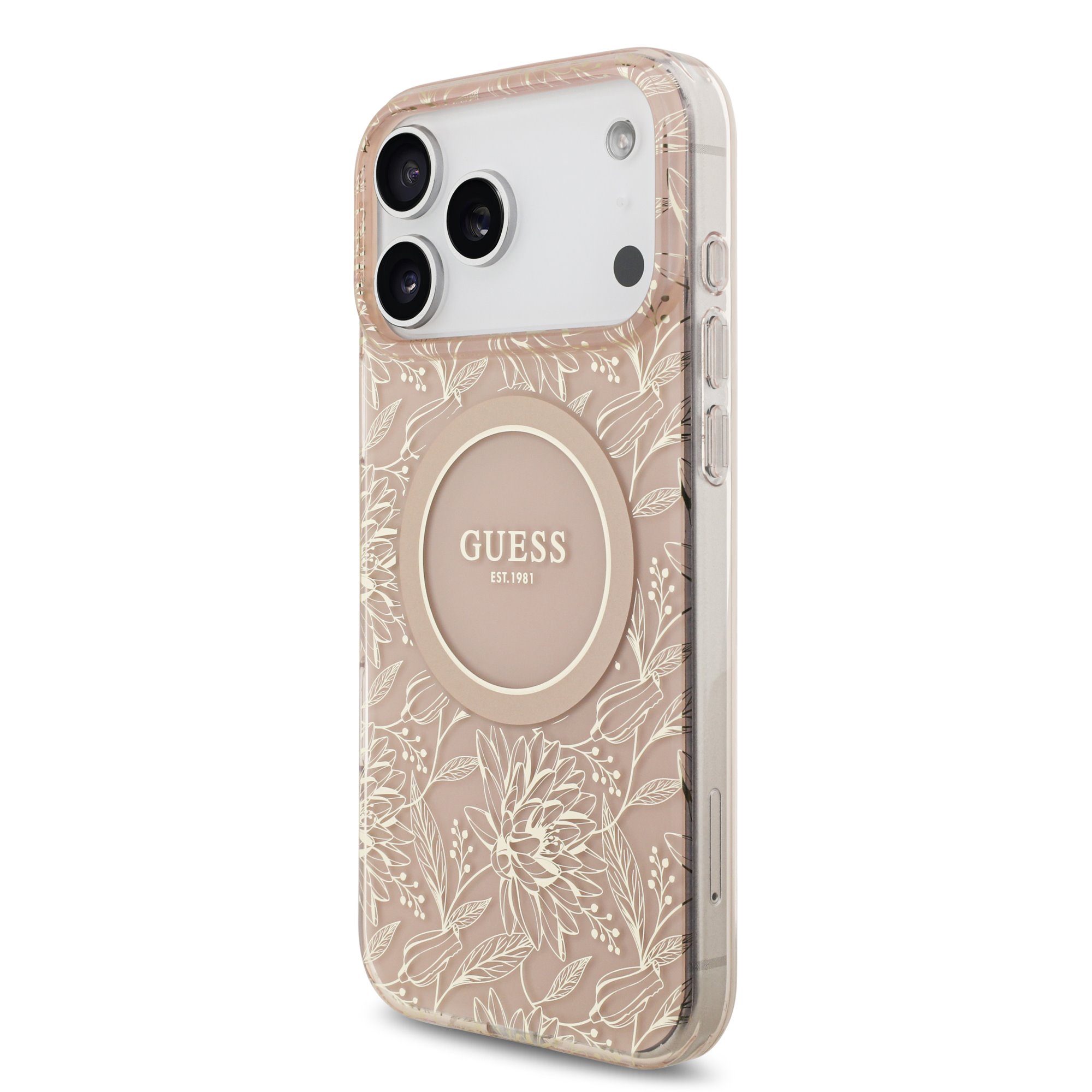 Guess IML Flowers Allover iPhone 17 Pro Max Case – With MagSafe and Cord – Pink