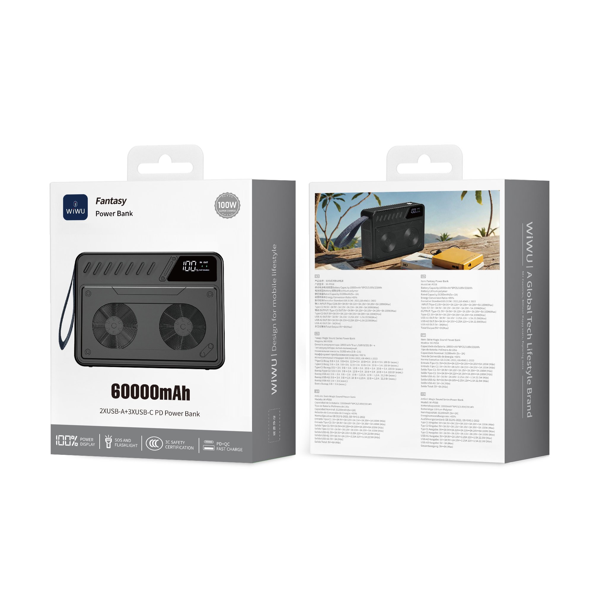 WiWU Powerbank 60000mAh – 3x USB-A en 2x Type-C ingang – Snelladen voor laptop, tablet, telefoon – Zilver