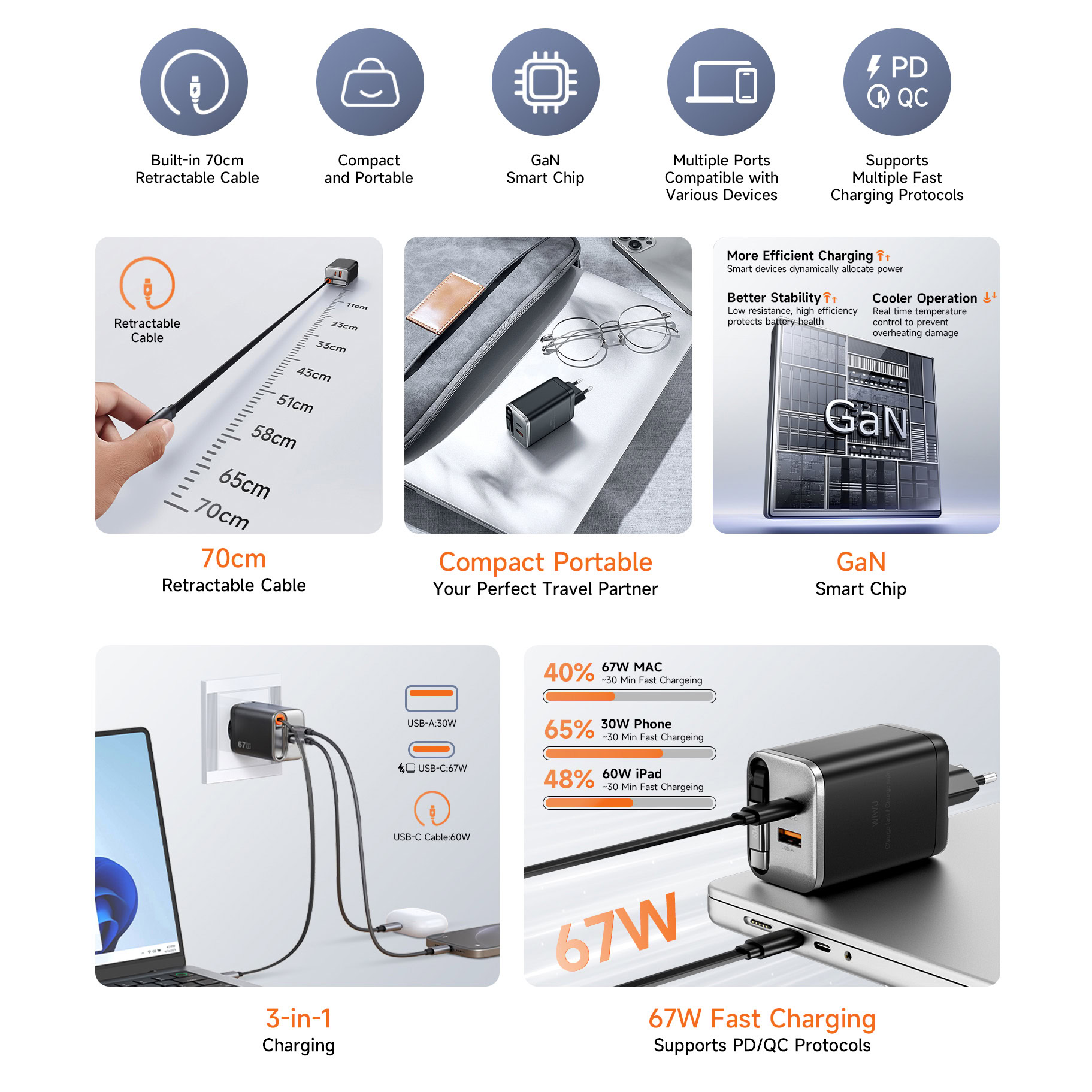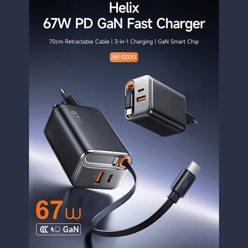 WiWU Tweepoorts Oplader Helix 67W snellader – Inclusief intrekbare kabel 70cm – Zwart